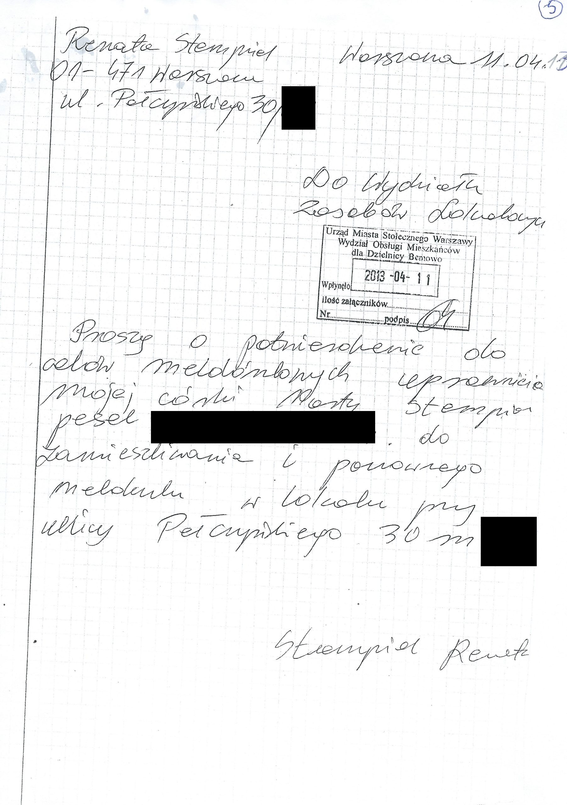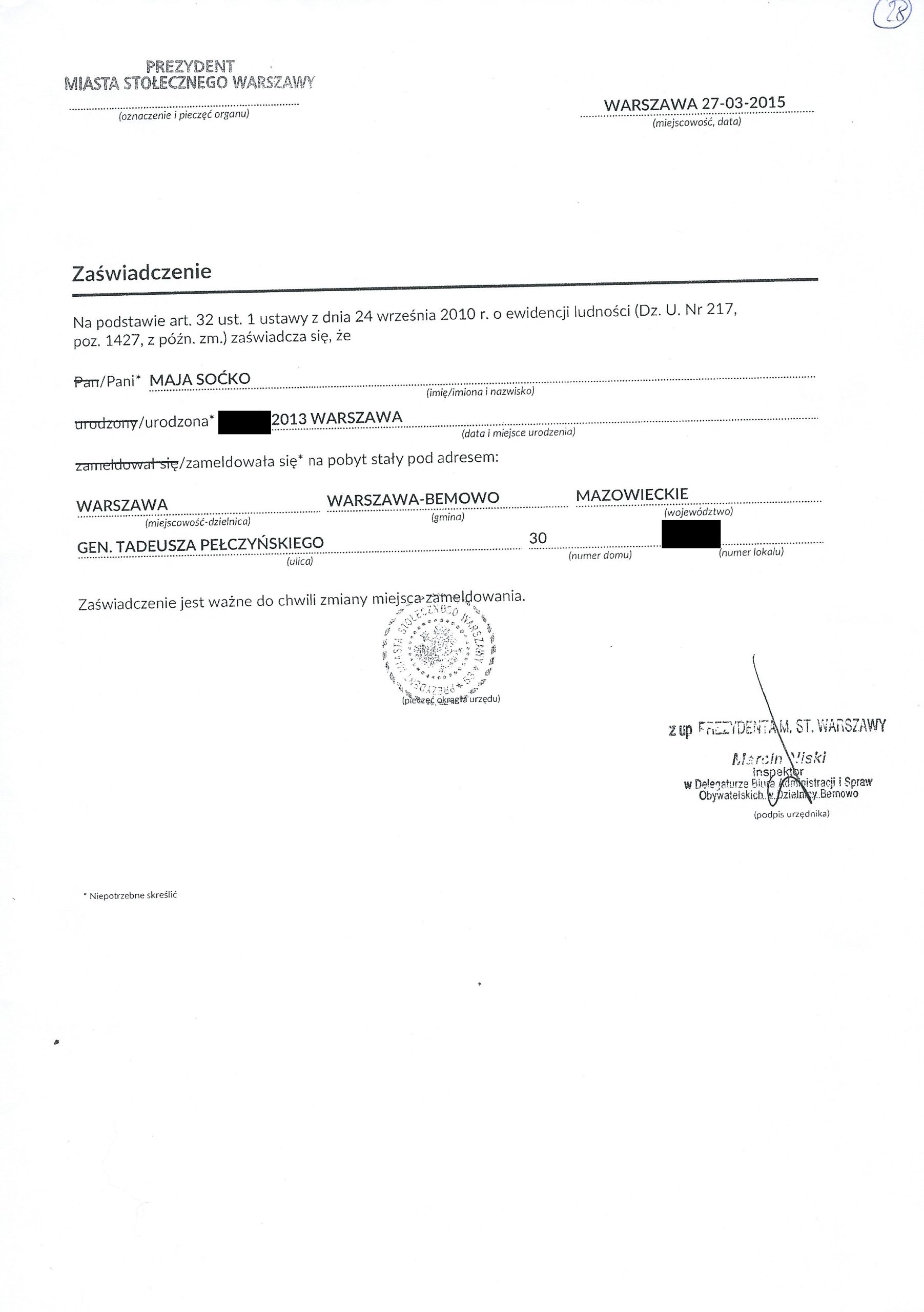 Sprawa jest tym dziwniejsza, że w marcu 2015 roku pani Renata uzyskała od Prezydent m. st. Warszaw potwierdzenie tego, że jej córka i wnuczka są zameldowane w lokalu przy Pełczyńskiego (potwierdzenie córki, potwierdzenie wnuczki)