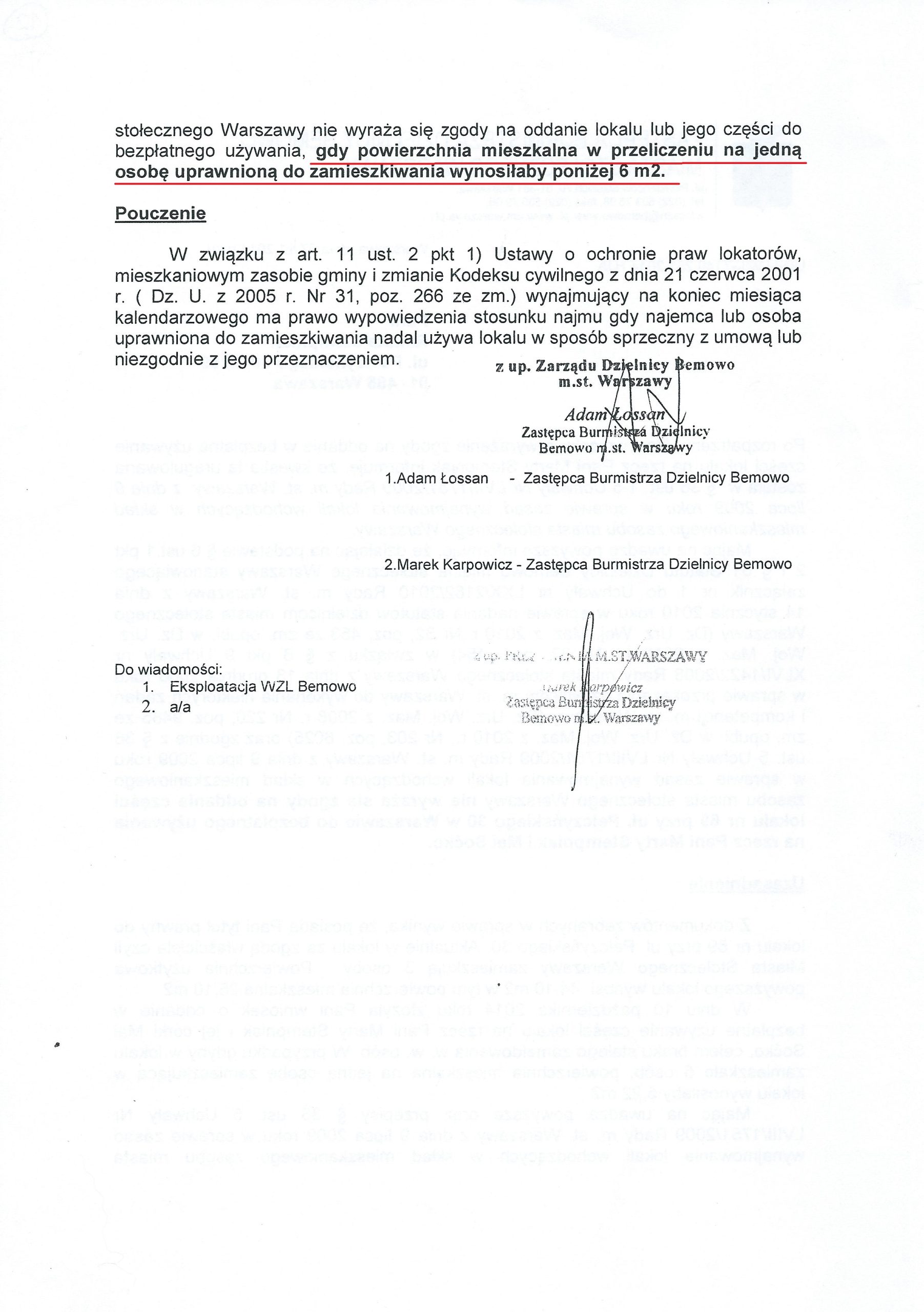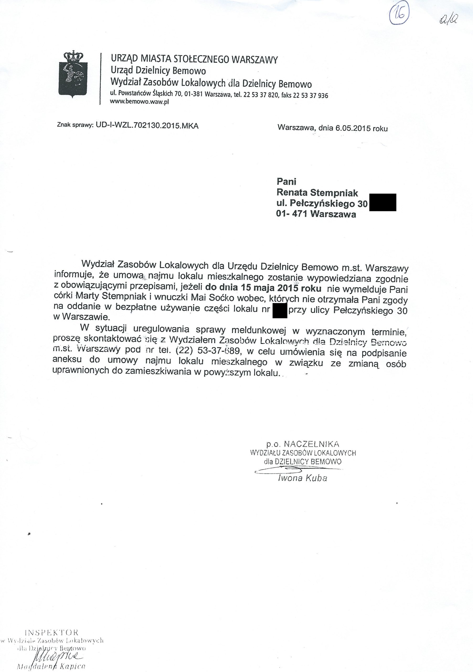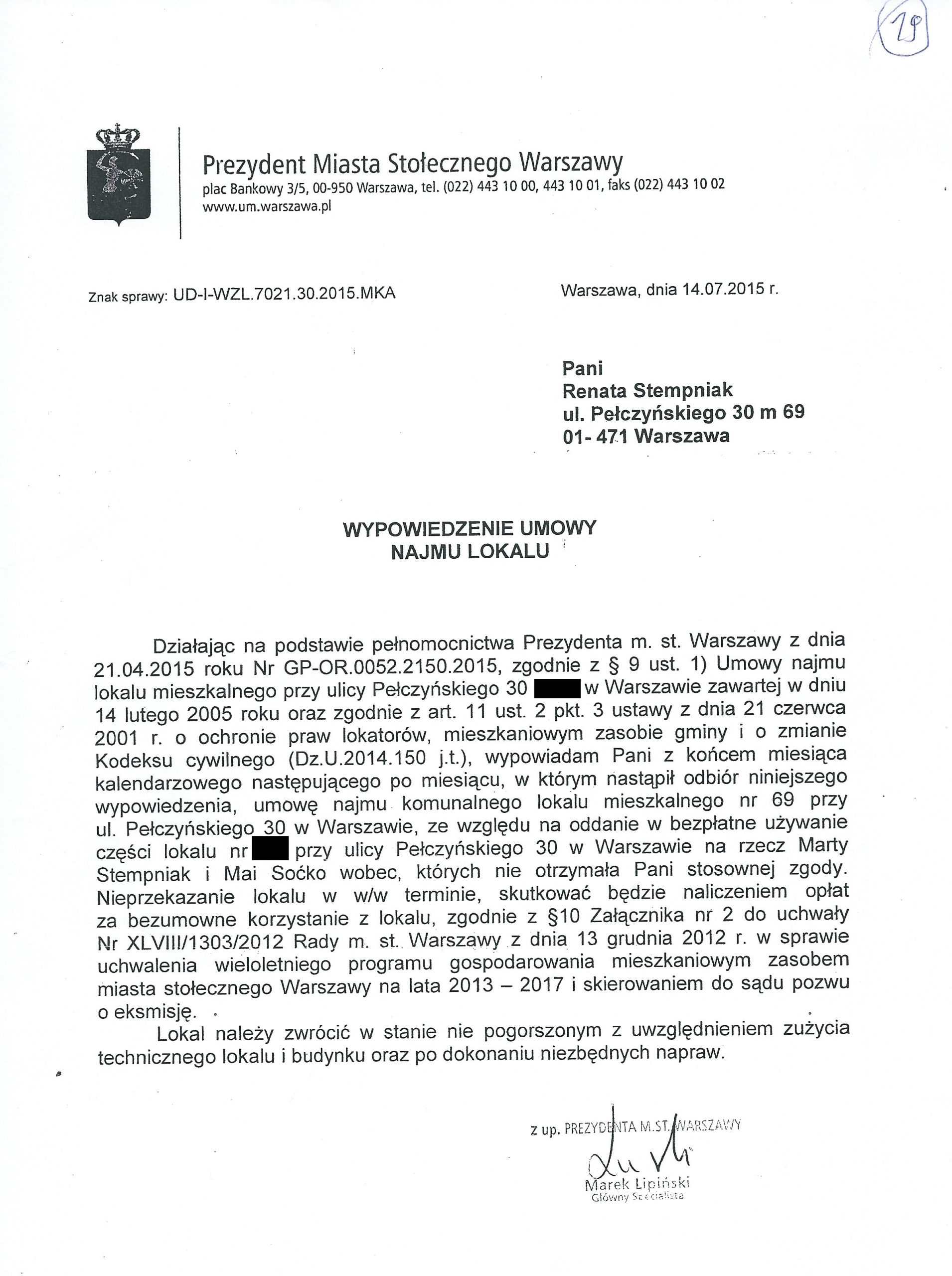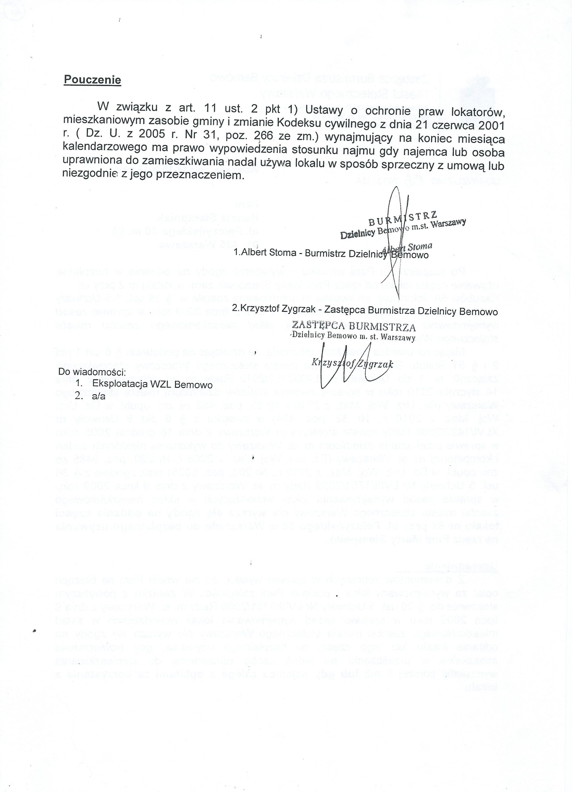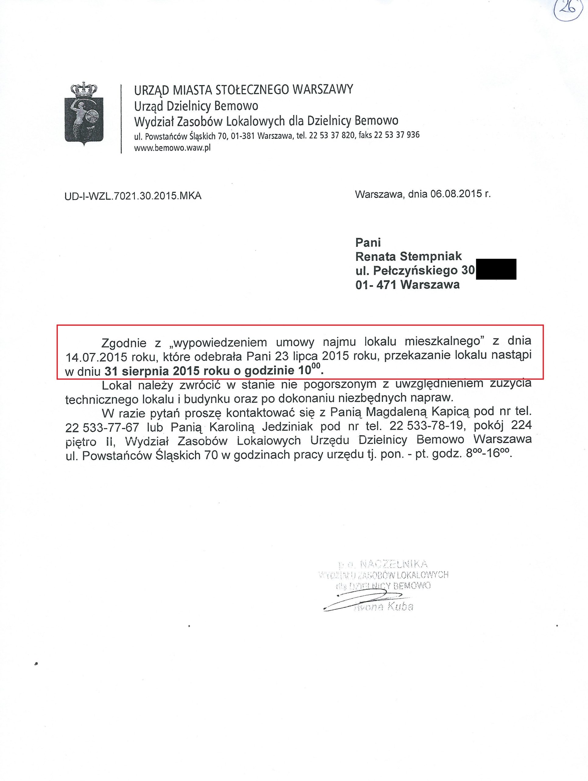 Bemowski Wydział Zasobów Lokalowych wezwał panią Renatę do wymeldowania córki i wnuczki z lokalu (pismo w załączeniu) i zagroził wypowiedzeniem umowy. Ponieważ pani Renata nie zdecydowała się na wyrzucenie z domu córki z dzieckiem (ze względu na stan zdrowia wymagającym rehabilitacji) umowa najmu lokalu została jej wypowiedziana (wypowiedzenie umowy w załączeniu)