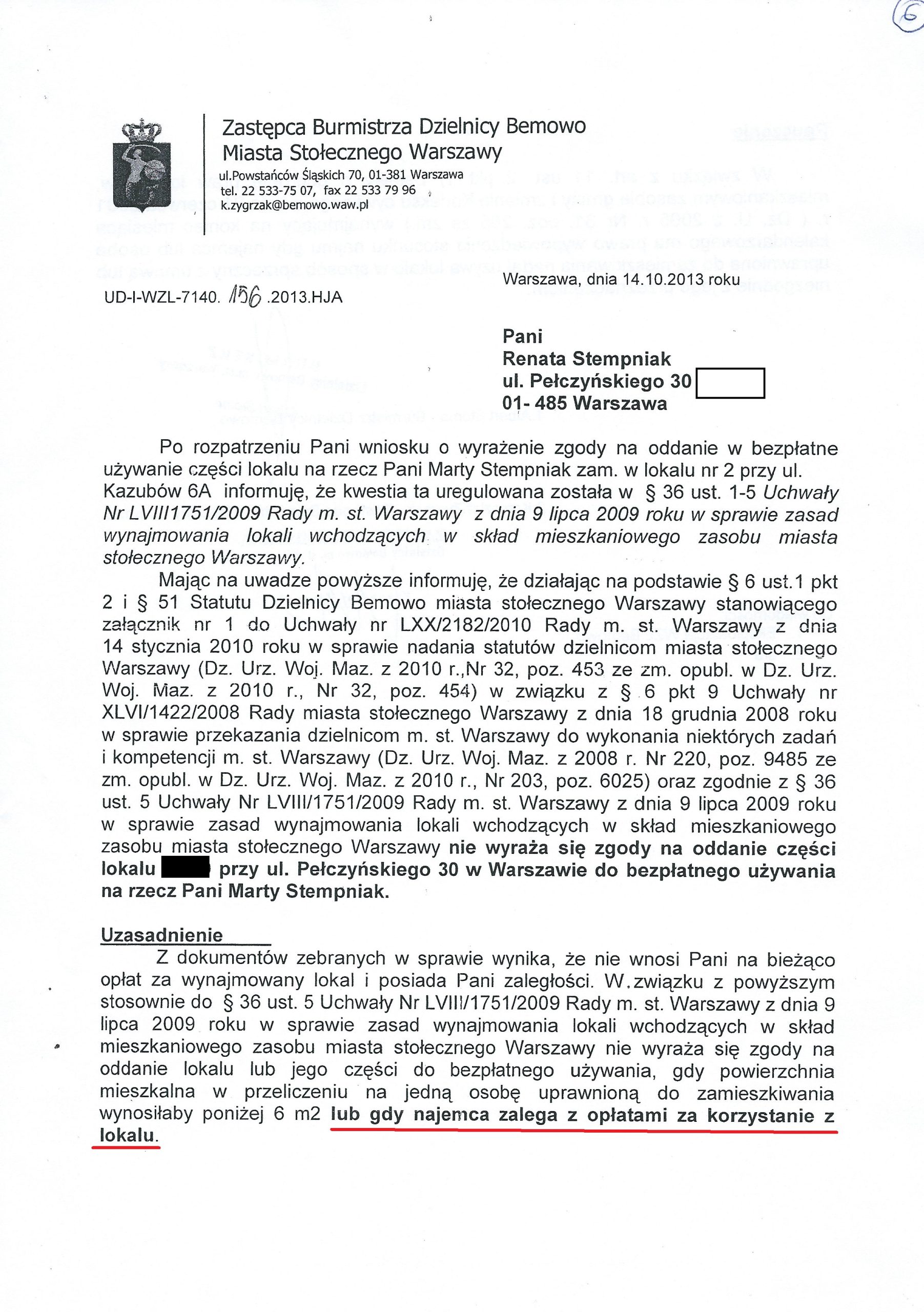 W roku 2013, tuż po wniosku o meldunek, dzielnica odmówiła twierdząc, niezgodnie z prawdą, że nie może zameldować nowych osób, ponieważ główna lokatorka zalega z czynszem (pismo w załączeniu str.1 str.2). Po pewnym czasie przedstawiciele dzielnicowego Wydziału Zasobów Lokalowych doszli jednak do wniosku, że popełnili błąd i zmienili wersję wydarzeń. Tym razem odmówili ze względu na fakt iż po zameldowaniu na osobę przypadałoby w lokalu przy Pełczyńskiego mniej niż 6m2, czyli córka pani Renaty wraz z wnuczką mogłaby się na podstawie tego starać o osobne mieszkanie komunalne (pismo w załączeniu str.1 str.2).