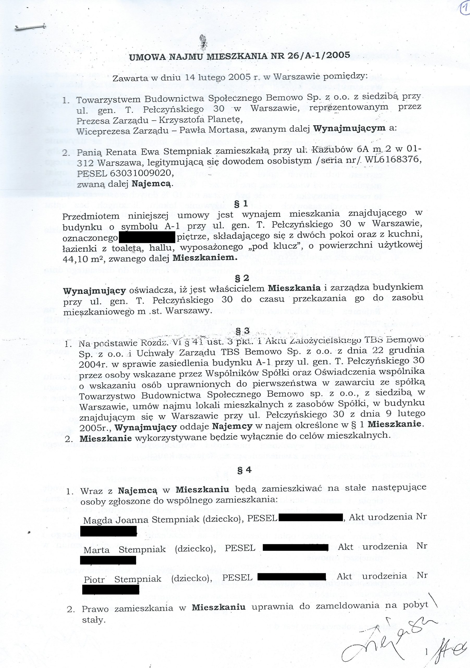 W roku 2011 pełnoletnia córka pani Renaty wyprowadziła się do chłopaka, jednak urzędnicy nie zmienili umowy najmu, w związku z czym wciąż w niej figuruje, pomimo że wniosła o wymeldowanie (umowa najmu w załączeniu).