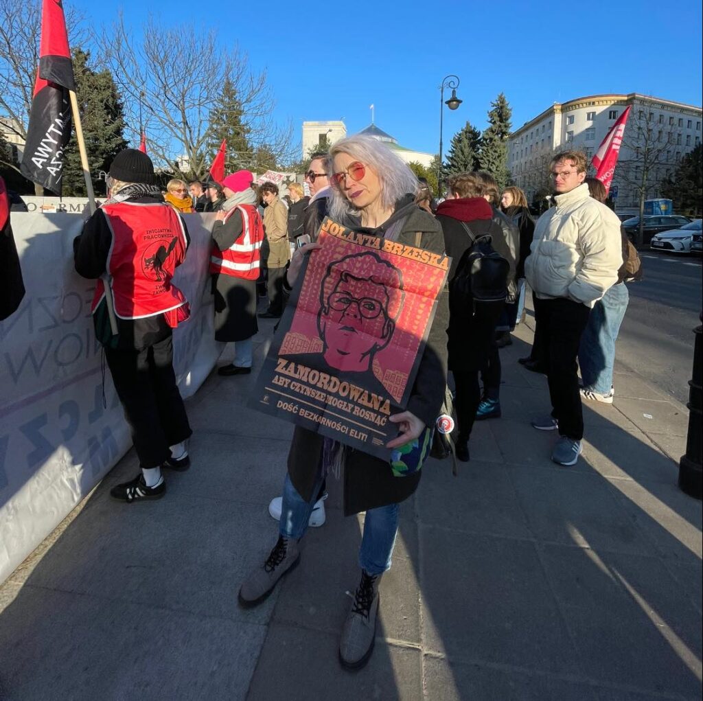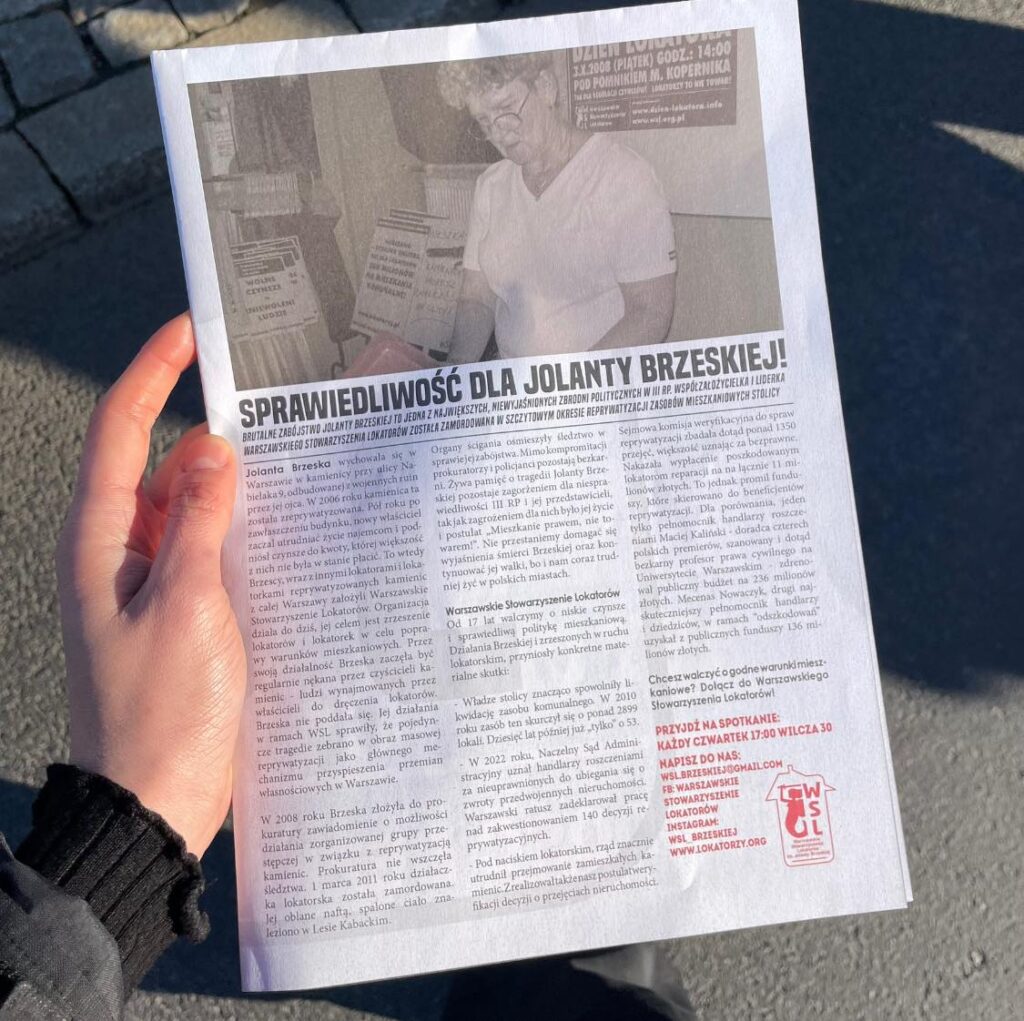 Podczas przemówień nasza działaczka przypomniała postać Jolanty Brzeskiej, kobiety, która z wyzyskiem walczyła na tyle skutecznie, że za tę walkę została zamordowana. Rozdaliśmy dziś plakato-gazetki z historią Brzeskiej oraz opisem procesu tuszowania jej morderstwa. Na dzisiejszej demonstracji obecnych było wiele działaczek kontynuujących walkę Brzeskiej o tanie mieszkania – znaczna większość osób zrzeszonych w stowarzyszeniach lokatorskich to właśnie kobiety. Zamierzamy kontynuować jej walkę, aż do ukarania sprawców zbrodni oraz zażegnania kryzysu mieszkaniowego!