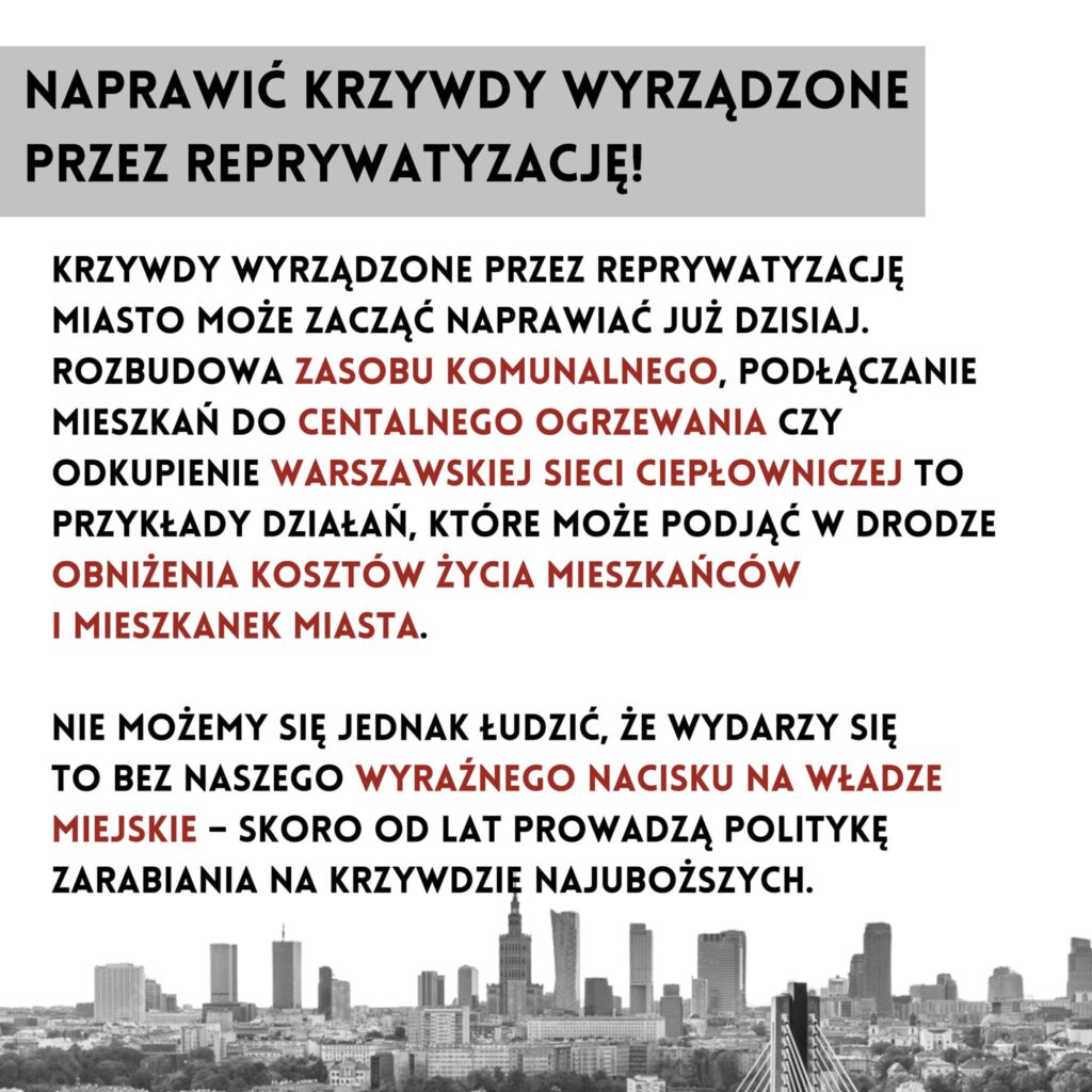 Do Miasta Stołecznego Warszawy, mówimy DOŚĆ WYZYSKOWI najuboższych i obiecujemy dopilnować, aby Warszawa stała się miastem dla mieszkańców i mieszkanek, nie dla elit i deweloperów!